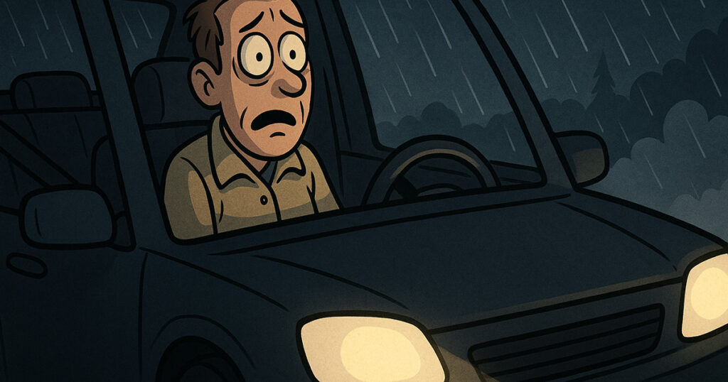 Knut hadde mistet bussen. Nå står han i veikanten og prøver å haike i et forferdelig uvær. Ut av skodda kommer det sigende en mørk bil. Den stopper rett ved siden av Knut.